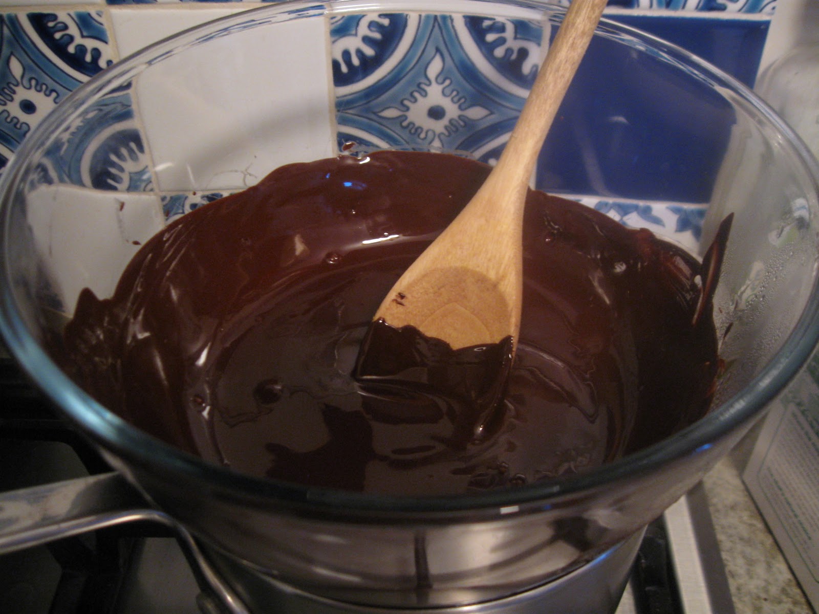 I was tempted to do many things that Martha would no doubt disapprove of, such as melt the chocolate directly in the pan, as pictured above. I could envision her tut-tutting, however, and it was spoiling my enjoyment of the process, so I decided to be well-behaved. Anyhow, melting chocolate the proper way produces a much lovelier meltiness - if you do it directly in the pan, you have to be on it 100% as it just sticks and burns extremely quickly and comes out a rather sticky sort of melted, whereas if you do it in a glass bowl over a pot of boiling water it creates a thick, velvety sort of meltedness. And the sound of a wooden spoon wading thickly through chocolate and pinging off the side of a glass bowl is one of my favourite sounds in the world, it is a very comforting, nostalgic sort of noise.